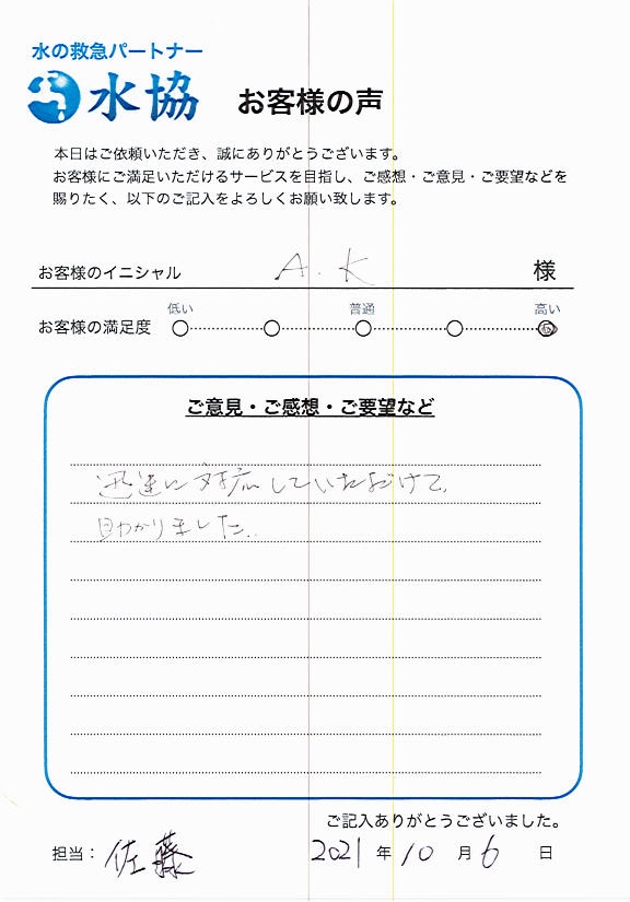 K.G様に限らず、初めてご依頼ただくお客様からよく「不安だった」とのお声を頂きます。そこで弊社ではしっかりとした説明はもちろんのこと、挨拶等のマナーなどの徹底も含め、お客様に少しでも安心してご依頼いただけるよう努めております。